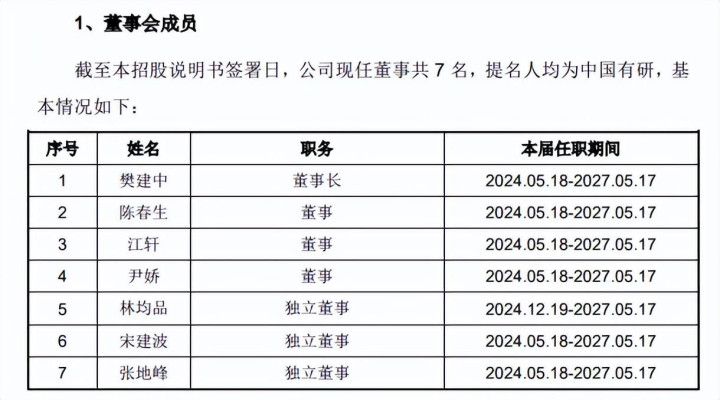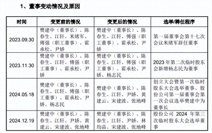 公司现任董事7名,包括董事长樊建中、董事陈春生、江轩、尹娇,零丁董事林均品、宋建波、张地峰,敷陈期内也发生过数次变更的情况,举例2023年9月,原董事米绪军离职,而股改完成后的第一届董事会名单中,职工董事傅强退出,新增零丁董事黄建云,但其任职7个月后离职,林均品成为新零丁董事。