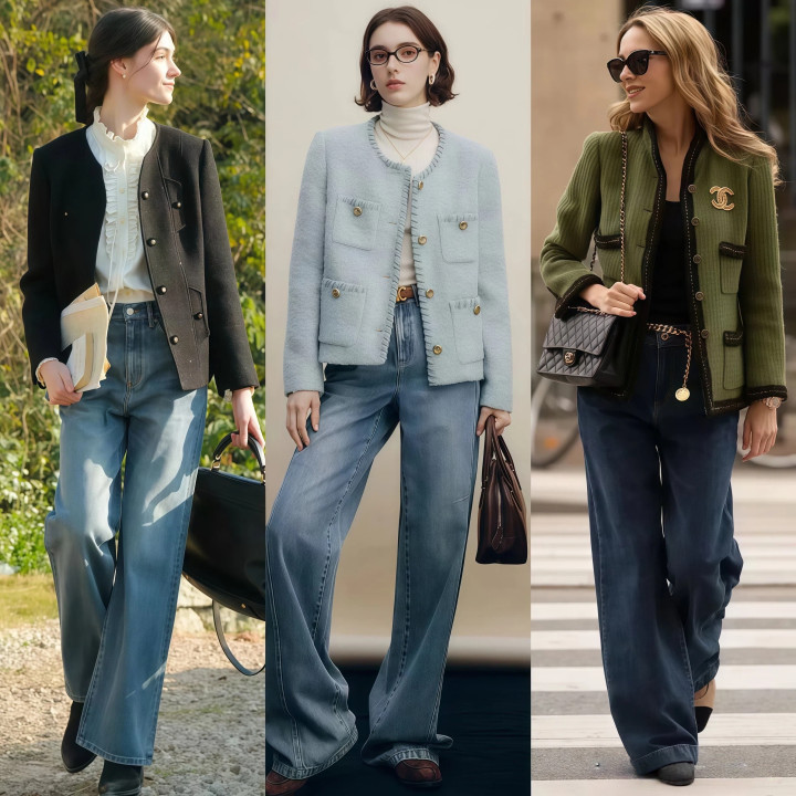 许多姐妹不敢穿小香风,怕显得太崇敬,其实只须下装选对了,小香风也能穿得很平淡。比如说牛仔裤,便是小香风外衣最佳的闲暇搭档,它自带的闲暇感能中庸小香风的崇敬感,全体看起来不会太端着。