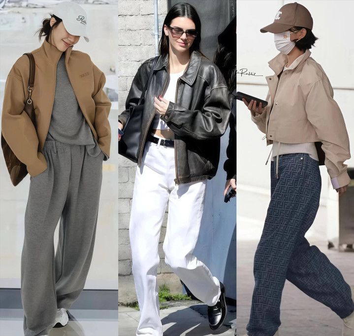 皮夹克一般皆偏短,下摆在腰线隔壁,搭配高腰阔腿裤的期间,可以把裤腰提到肚脐眼的位置,上半身和下半身就变成了3:7的比例,一键拉长腿部线条。