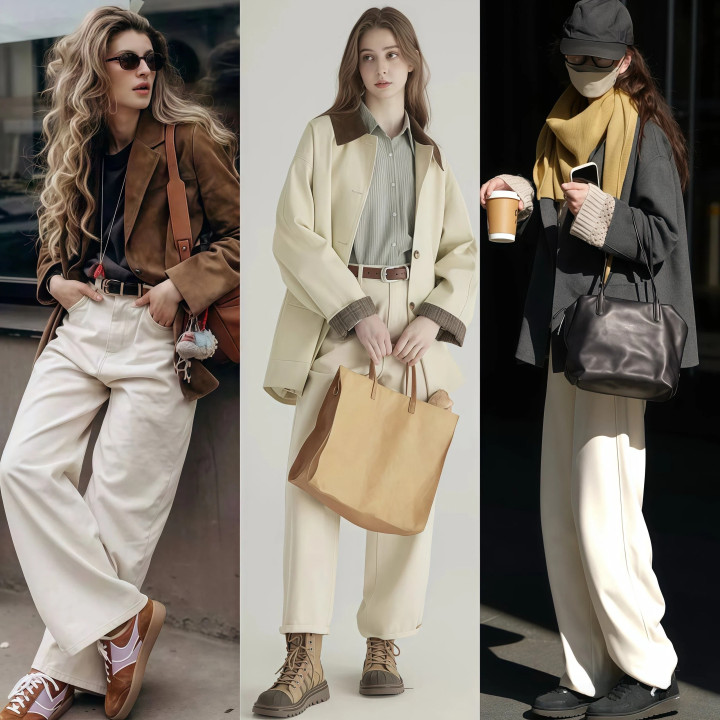 短外衣+高腰裤+肤浅内搭,这个组合天然不出错,但也容易显得太素;思要让造型更有看点,可以用配饰来加多细节。